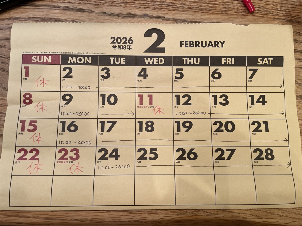2月のお休み